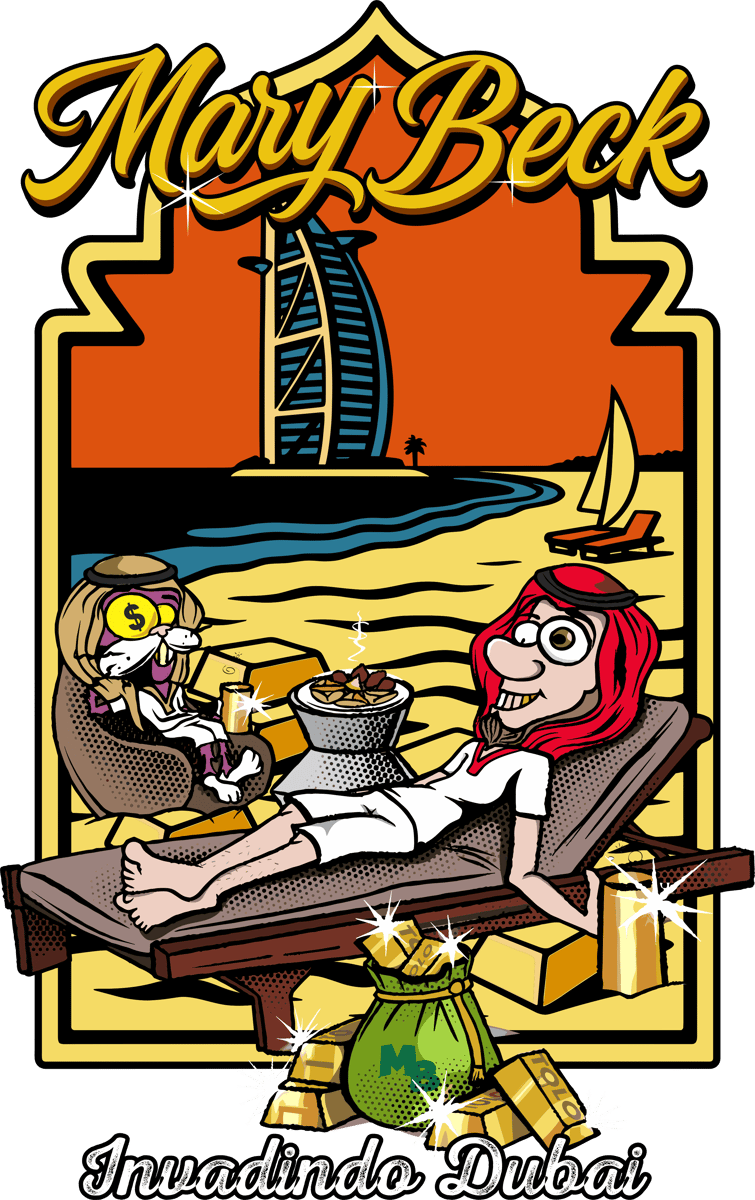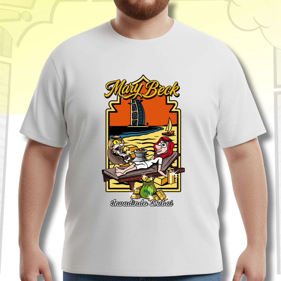 A camiseta Dubai da Mary Beck traz o icônico Burj Al Arab, símbolo máximo do esplendor da cidade, em uma estampa exclusiva que mistura sofisticação, cultura e irreverência.